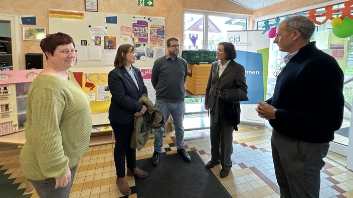 Hoher Besuch in der Kindertagesstätte im Schmelzerwald: Dr. Kornelie Schütz-Scheifele, seit 2017 Präsidentin des Christlichen Jugenddorfwerks Deutschlands (CJD), machte gemeinsam mit Vorständin Petra Densborn Station in St. Ingbert. Begrüßt wurden die Gäste von Geschäftsführer Dieter Thielen, Fachbereichsleiter Tobias Verburg und Teamleiterin Martina Huter-Theobald.